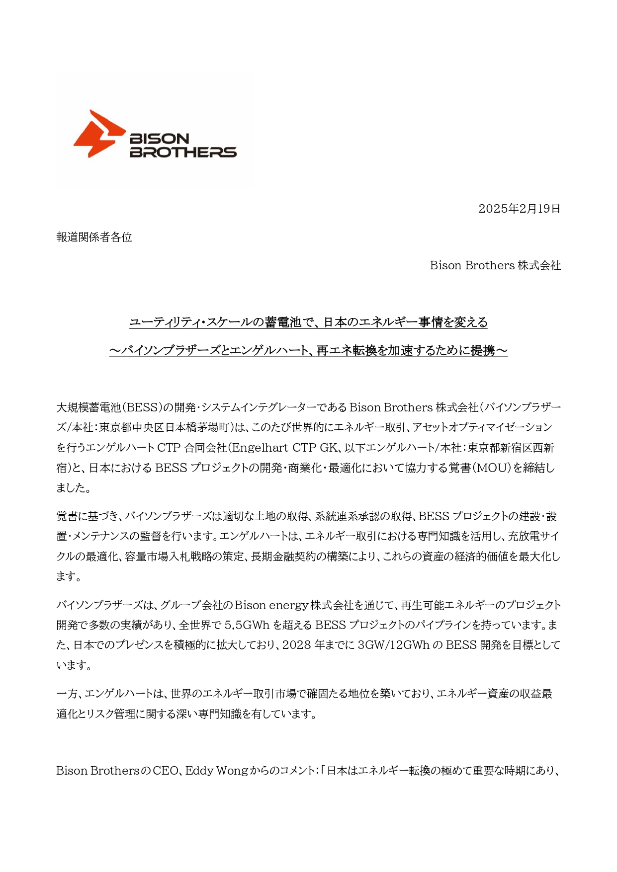 August 28, 2023Bison Brothersは日本のBison Energyと戦略的パートナーシップを構築し、12 MWHの公共事業規模のエネルギー貯蔵を提供する